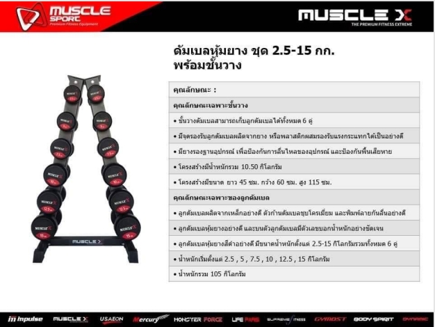 • มีดัมเบลครบ 6 คู่ (2.5 / 5 / 7.5 / 10 / 12.5 / 15 kg)